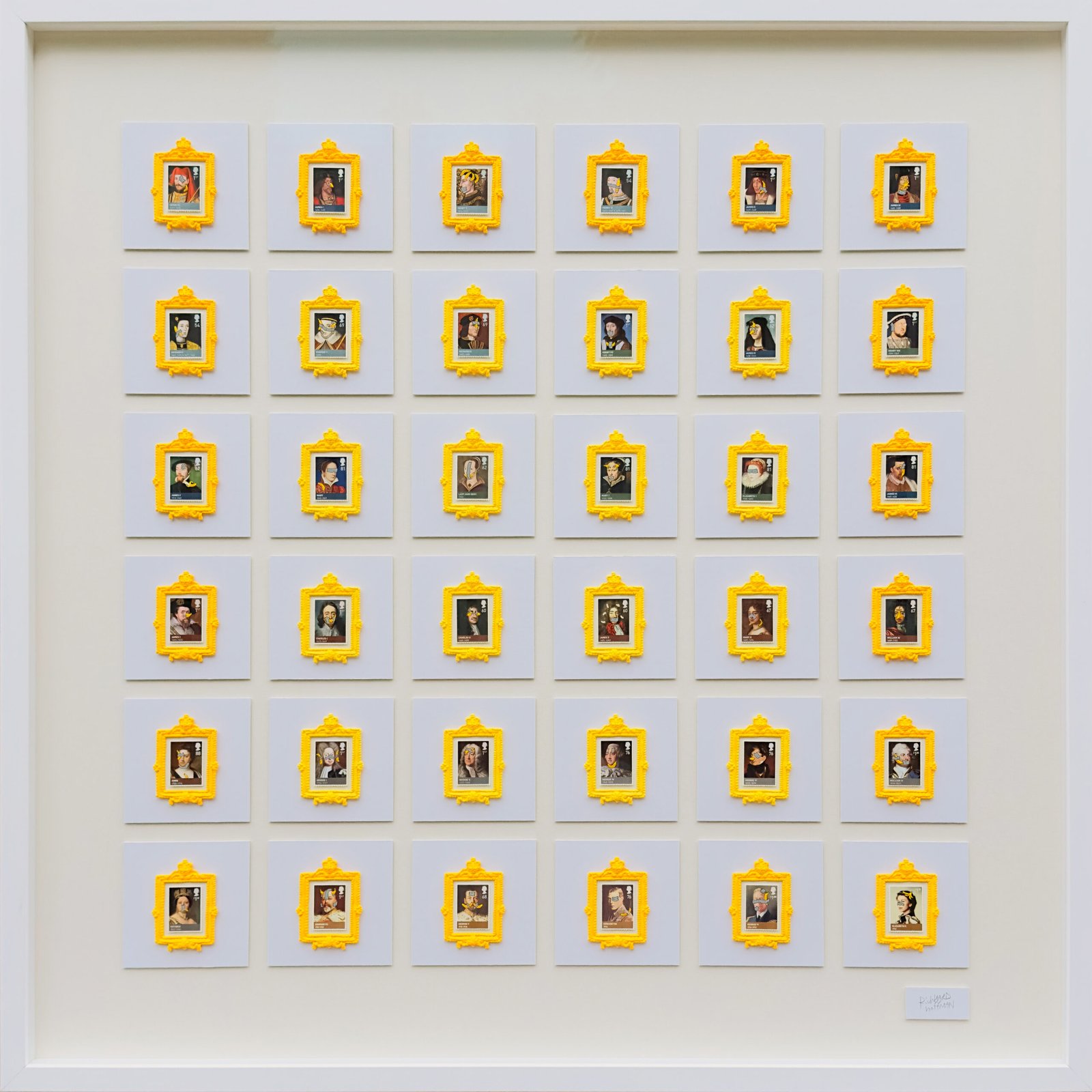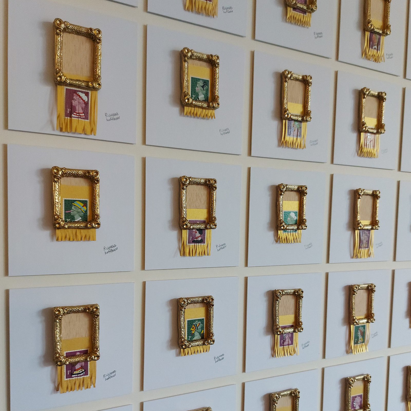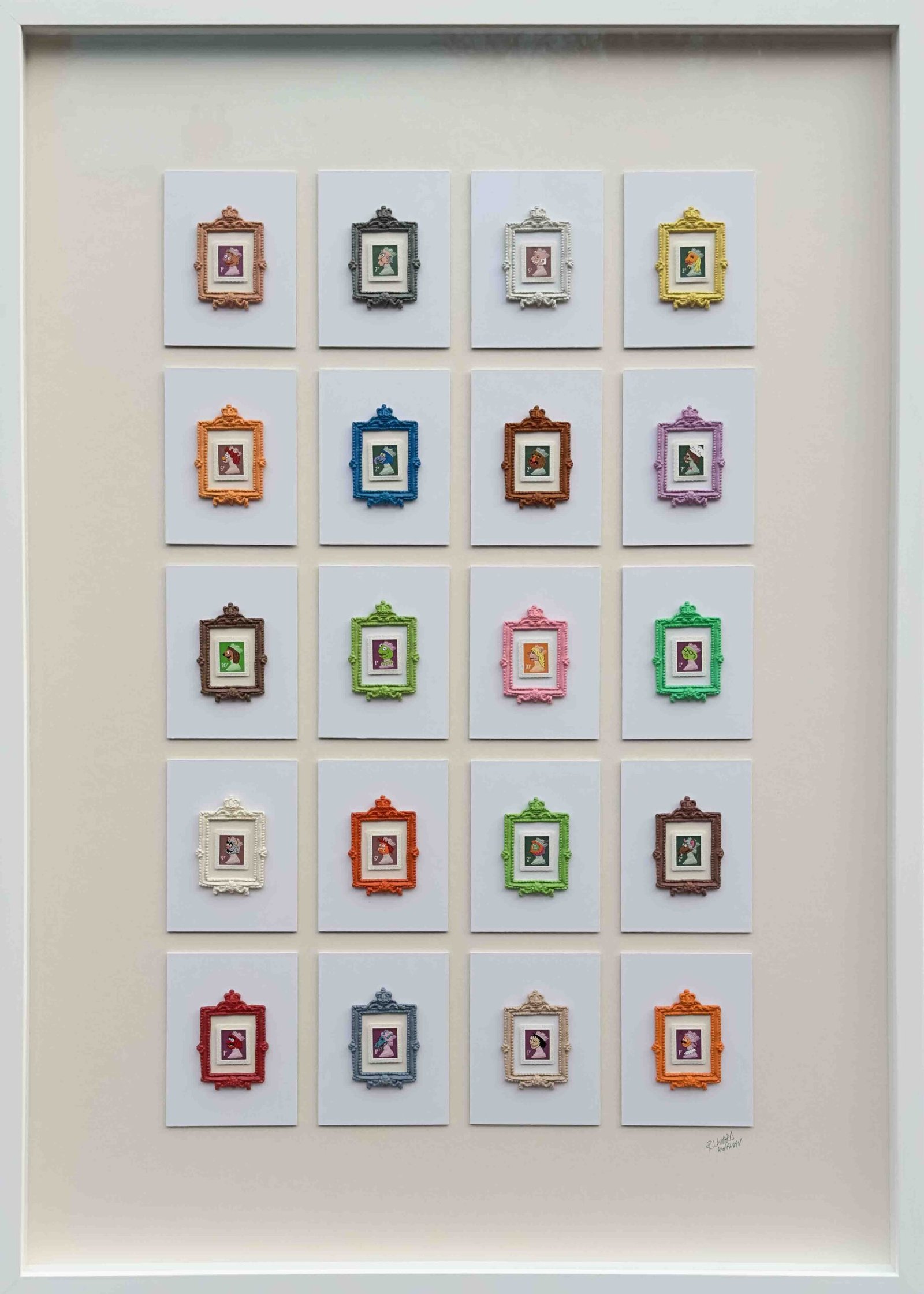 Over painted genuine postage stamps with handmade tiny frames, in hardwood frame with museum acrylic.