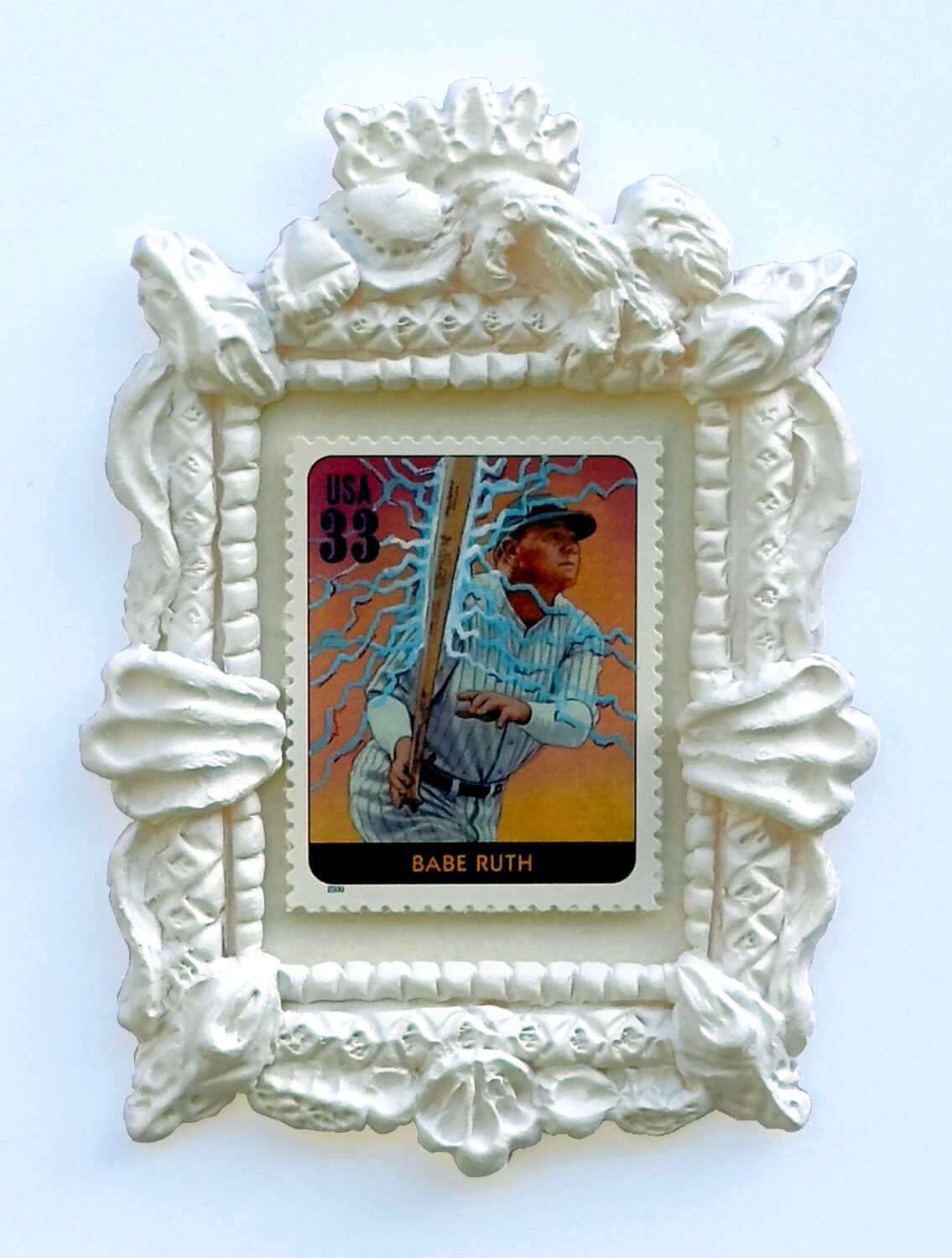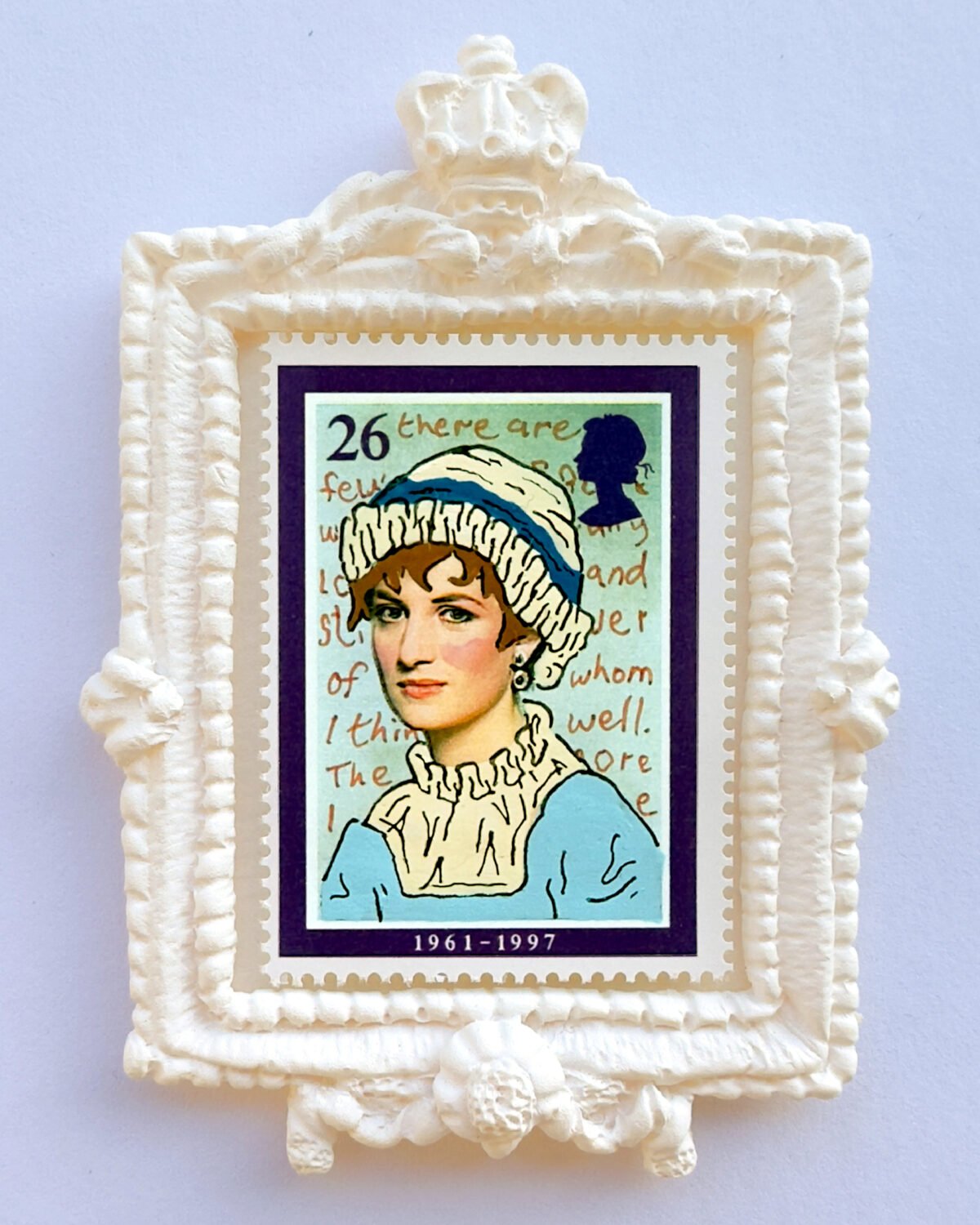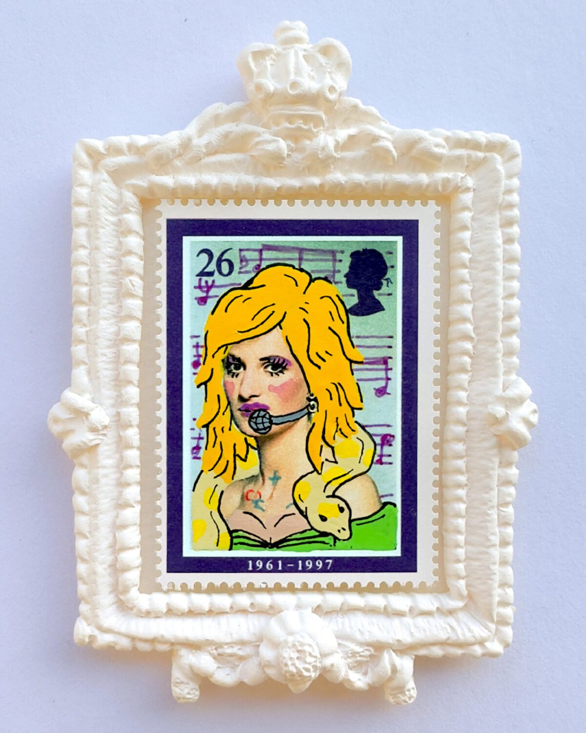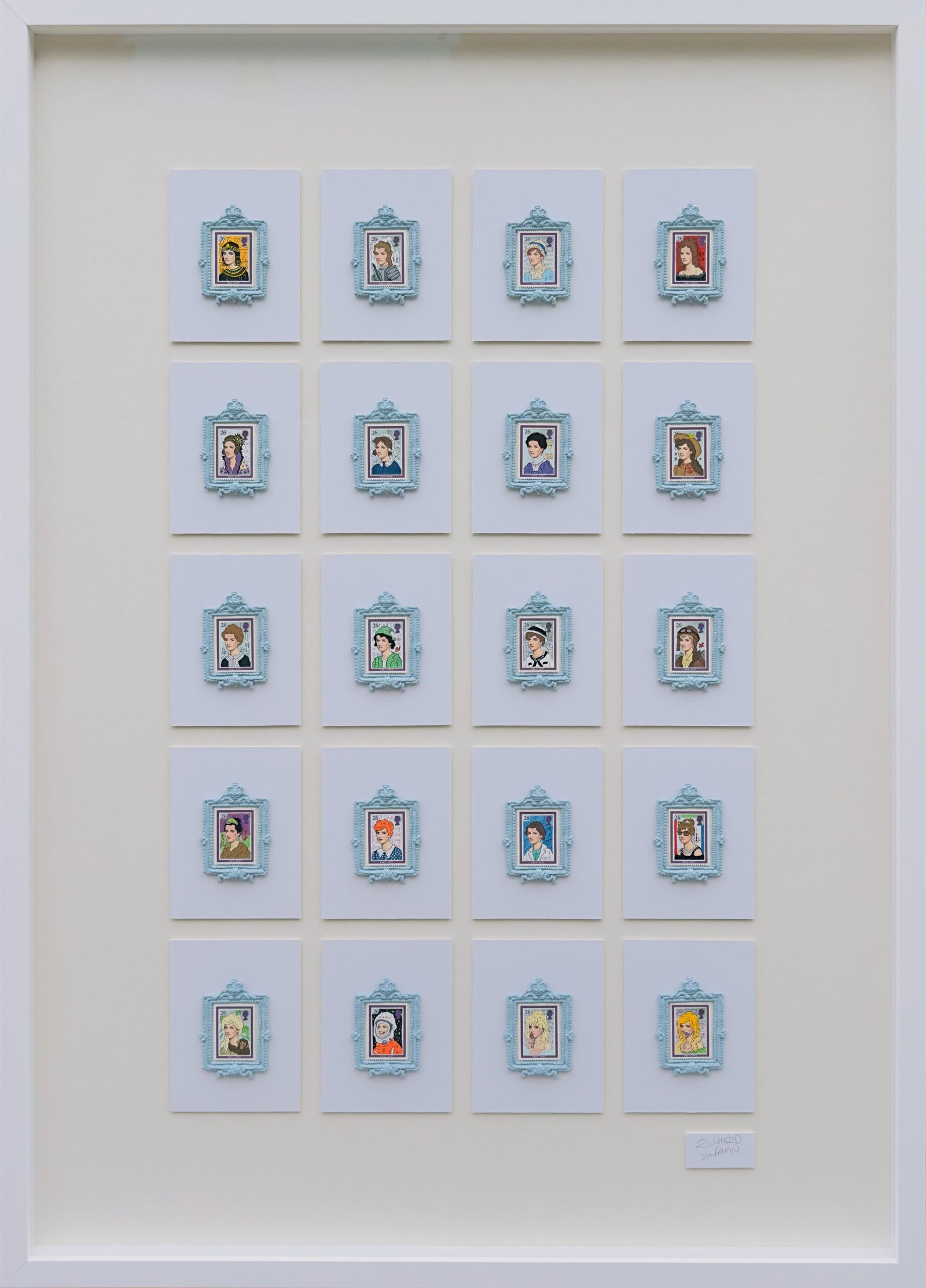 Over painted genuine postage stamps with handmade tiny frames, in hardwood frame with museum acrylic.