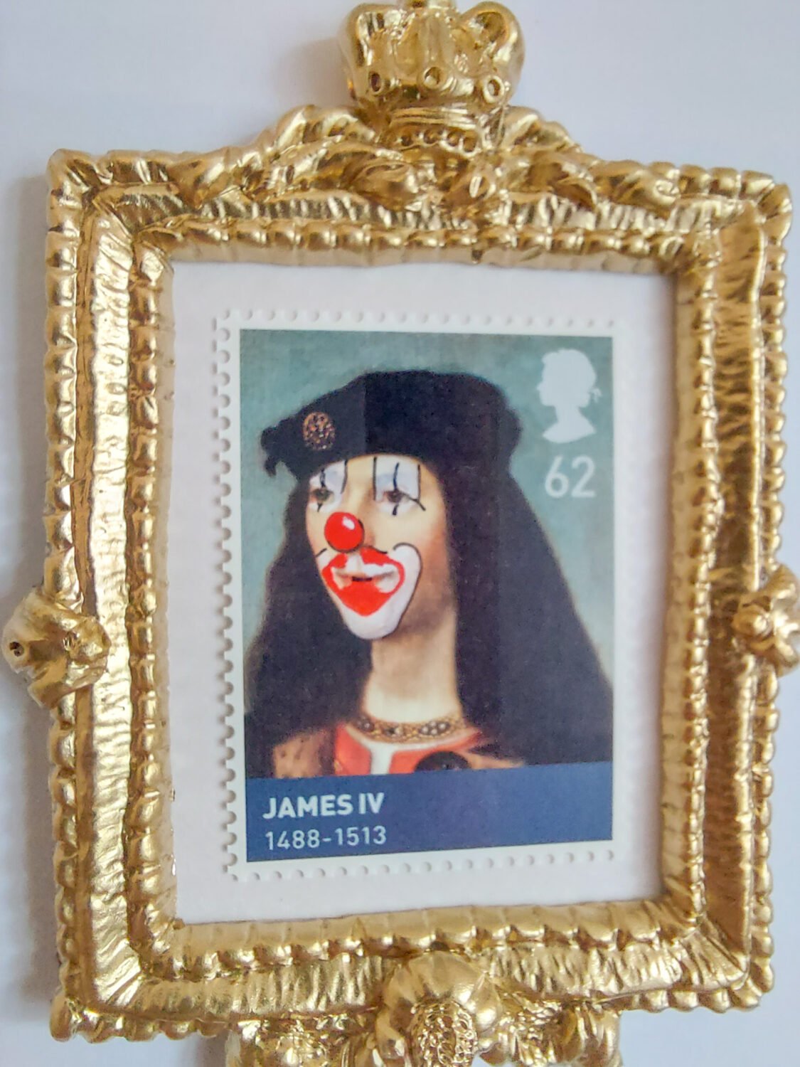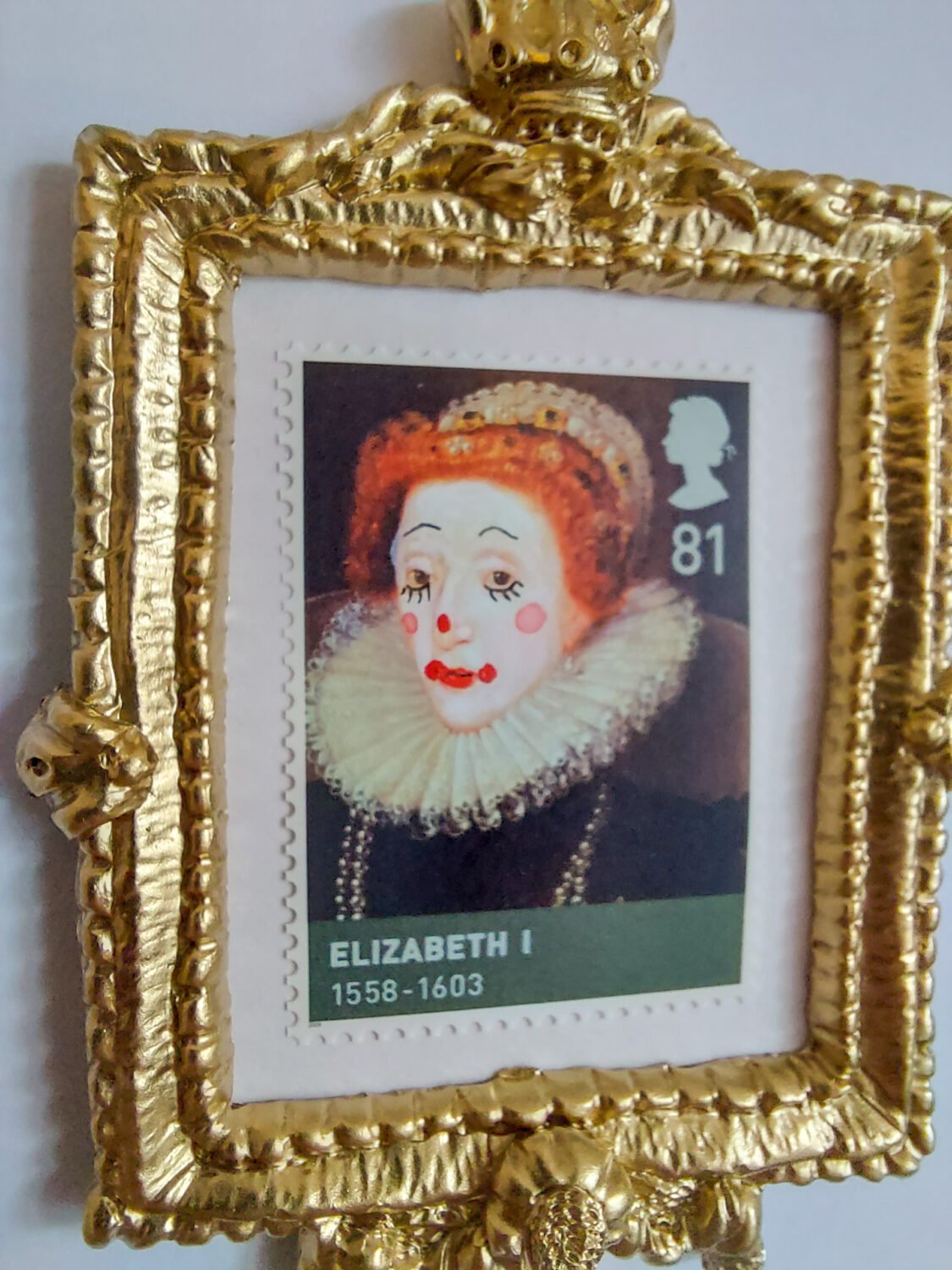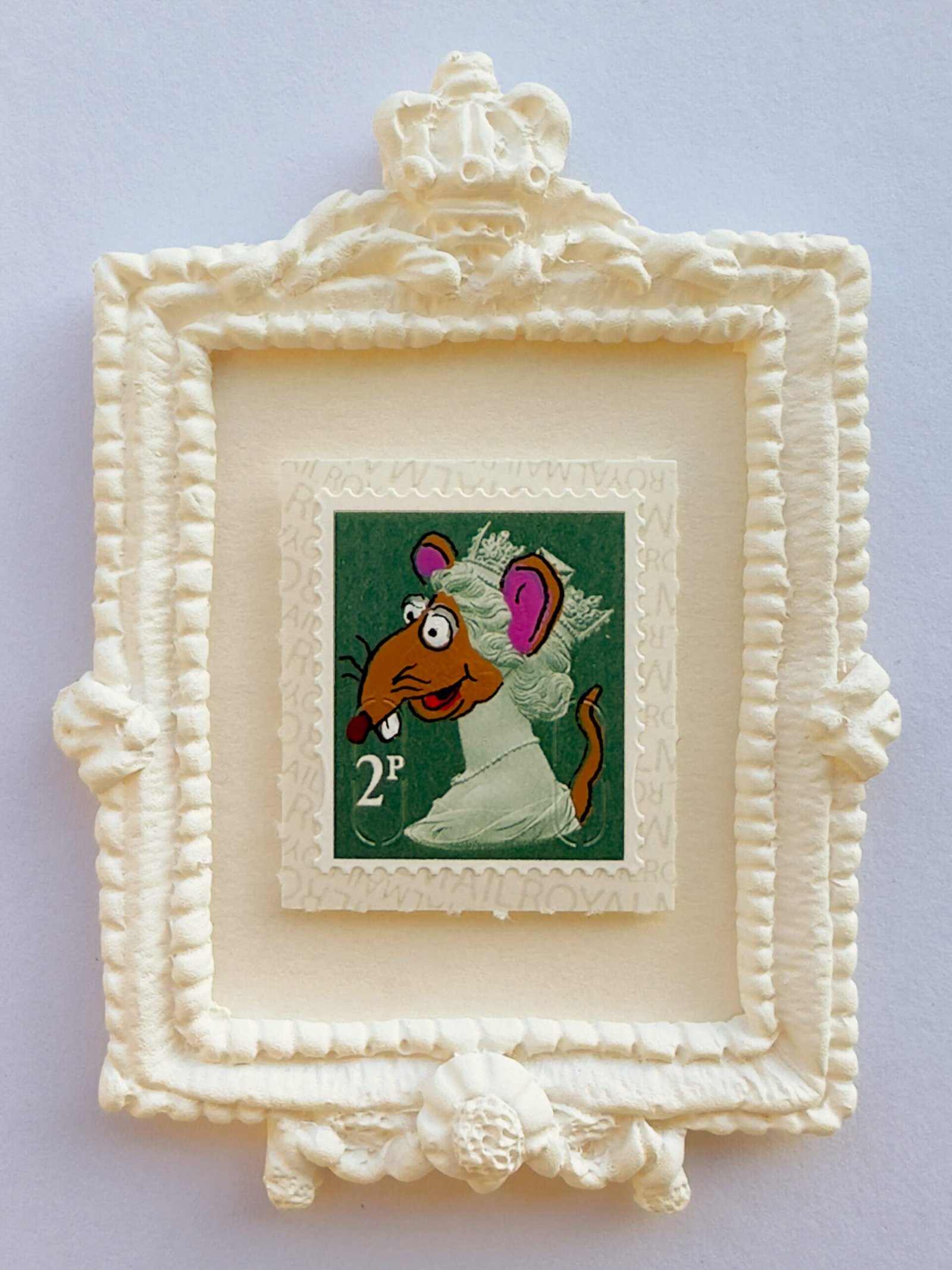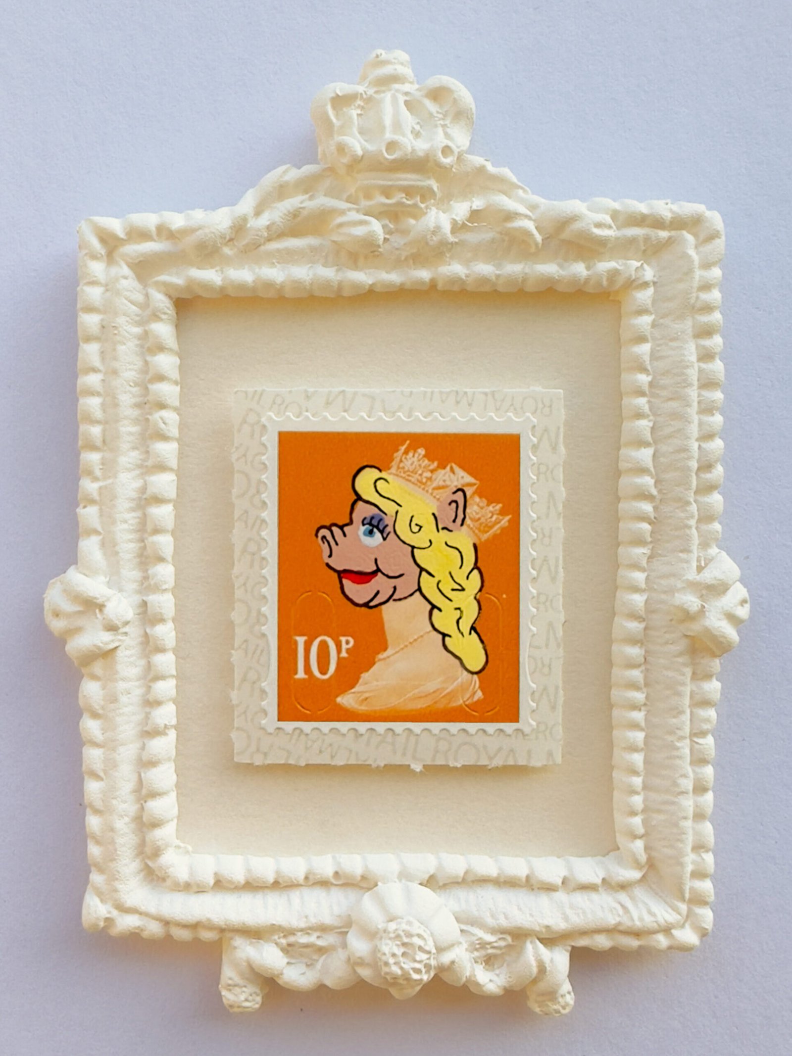 Queen Elizabeth II meets Muppet theatre in this felted mash-up—her iconic profile reworked as puppet satire, poking fun at royal performance and public identity.